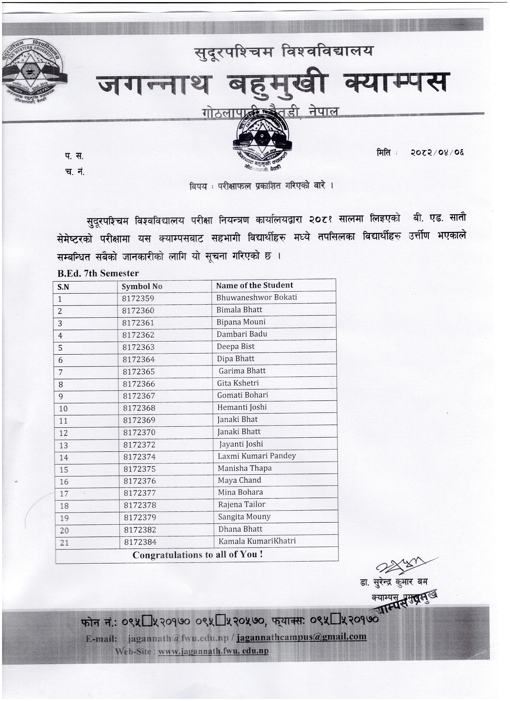 Result of B.Ed and BBS First Semester 2082